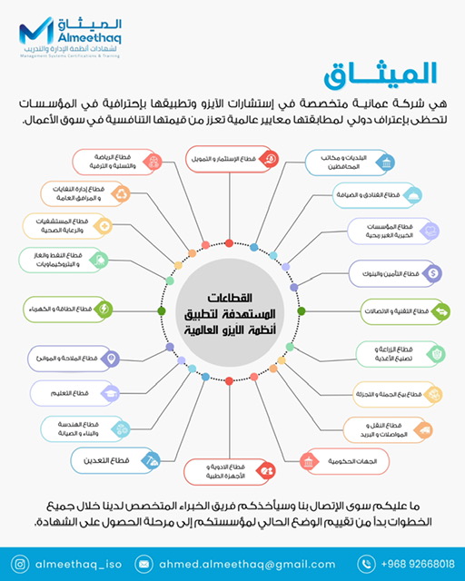 الميثاق جهة متسارعة النمو في سلطنة عمان في مجال التأهيل لشهادات الأيزو العالميه للمؤسسات والشركات و المصانع. من هذه الشهادات: ISO 9001, ISO 14001 & ISO 45001 و غيرها من شهادات الإدارة.