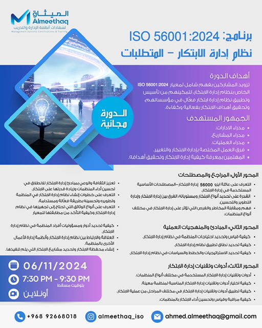 Al-Meethaq is a developing consultant in Oman in the field of ISO qualification providing services to Government and Privates organizations. Example of the qualification services for Certifications such as: ISO 9001, ISO 14001 and ISO 45001, Others…
